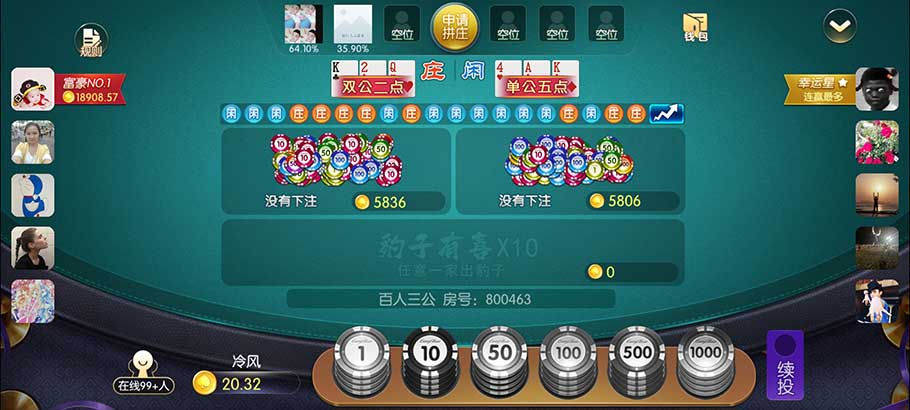 与传统的两人或小范围对局的棋牌游戏不同,百人三公最多可容纳百人同时参与战斗。这种大规模的对战模式使得游戏的紧张感和刺激性大大增强。每一轮的发牌、下注和比牌过程都充满了不确定性,玩家需要时刻关注局势的变化,根据其他玩家的下注情况和自己的手牌状态做出准确的判断。