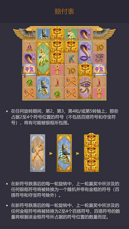 埃及探秘宝典是一个6轴5行的视频老虎机游戏(在第2、第3、第4和第5轴的顶部设有一个附加轴),编入了多路连消百搭以及带有奖金倍数递增的免费旋转。