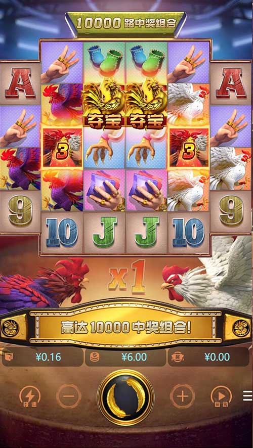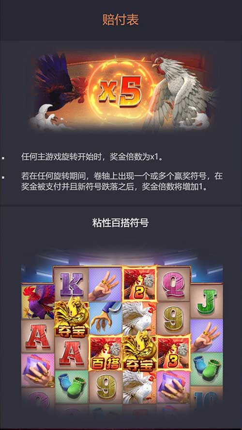 • 斗鸡是一个6轴4行(卷轴2、3、4和5各有额外一行)的视频老虎机游戏,编入了粘性百搭符号和奖金倍数。