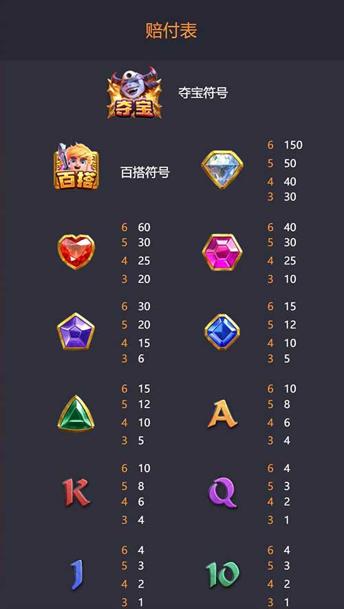 • 一条中奖路所得的奖励等同于显示在“赔付表”上的符号赔付值乘以投注大小和投注倍数。